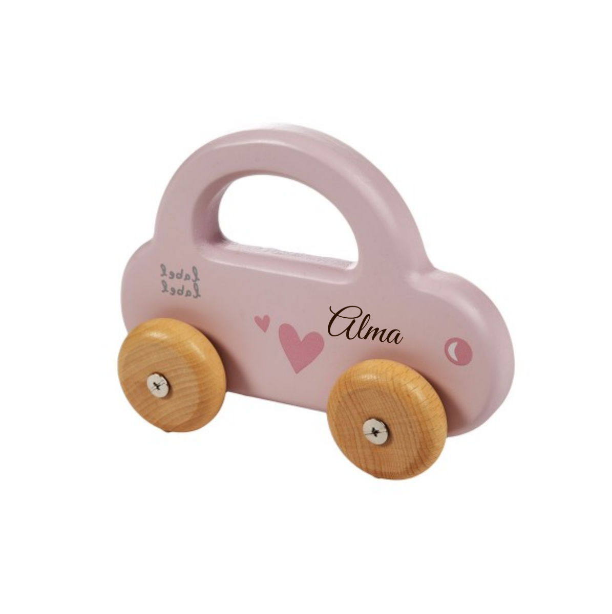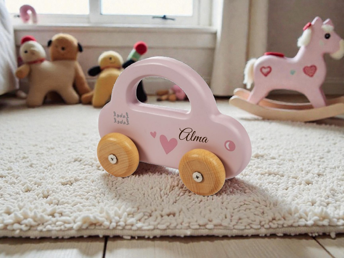 Pour un cadeau complet, découvrez notre sélection de jouets en bois personnalisés pour enfant et nos décorations de chambre personnalisées qui s’accordent parfaitement avec la voiture rose.