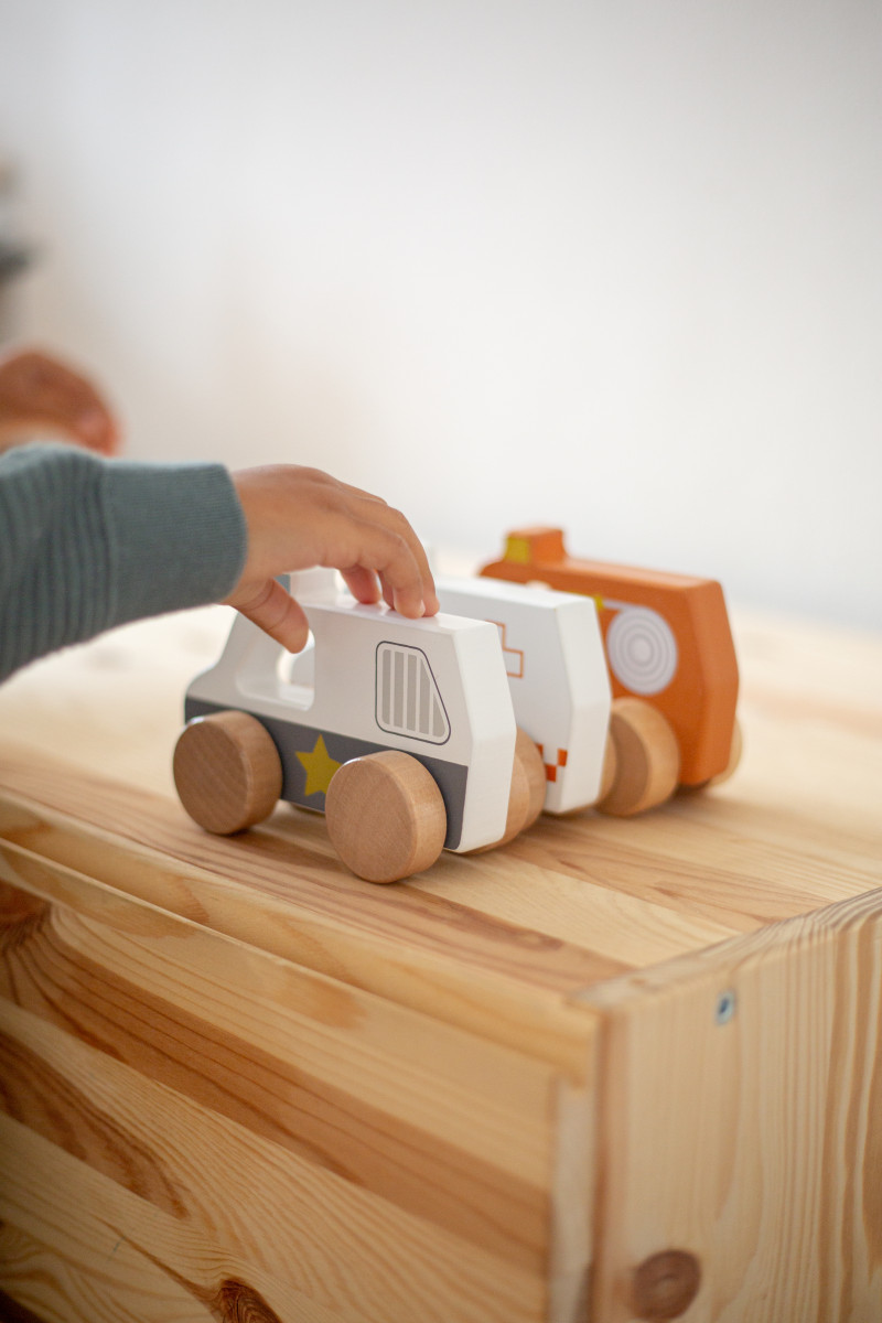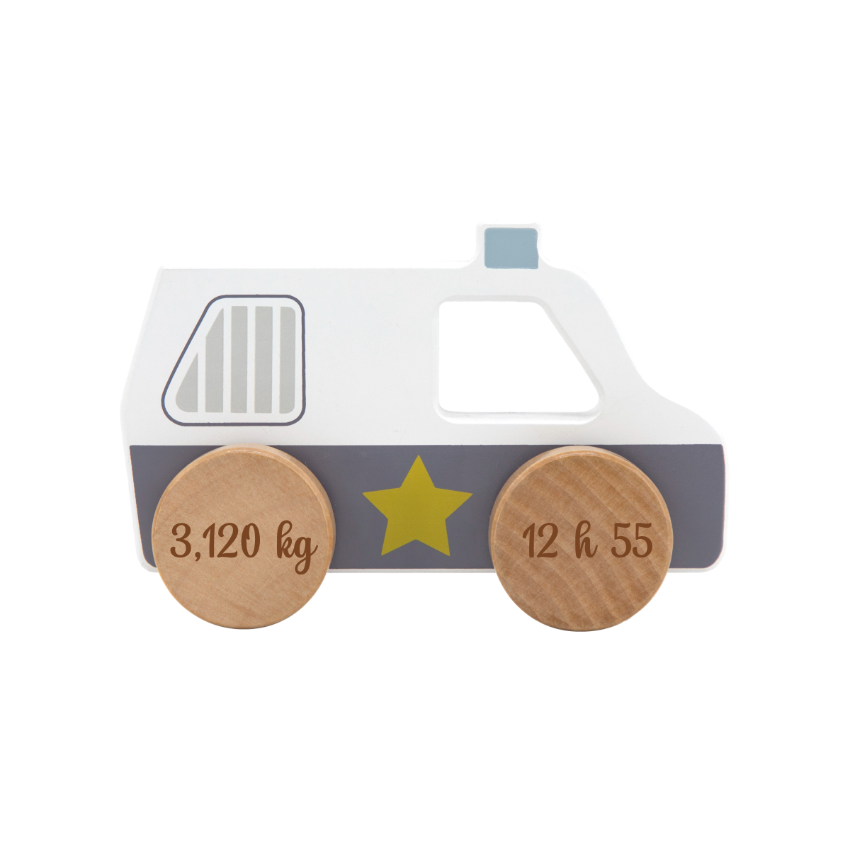 La voiture de police en bois personnalisée de la marque Label label est une petite voiture de 13 × 9 × 5 cm, en bois de haute qualité, recommandée dès 18 mois. Sa singularité : le prénom de l’enfant et ses informations de naissance — date, heure, poids ou taille — sont gravés au laser sur ses roues. Ce n’est pas un objet de décoration qui prend la poussière sur une étagère : c’est un jouet qui roule, que l’enfant manipule, et sur lequel les chiffres de son premier jour sont inscrits pour toujours.