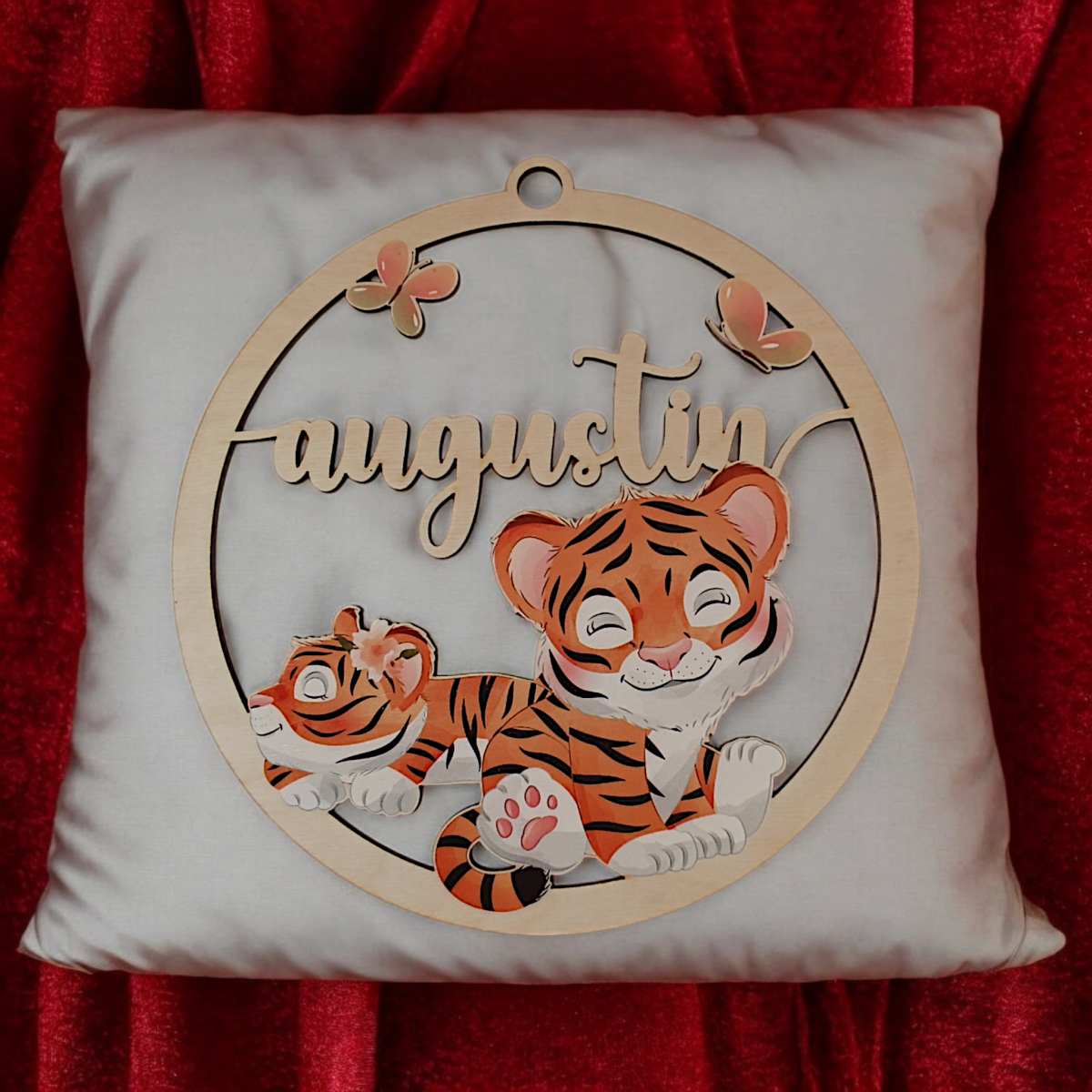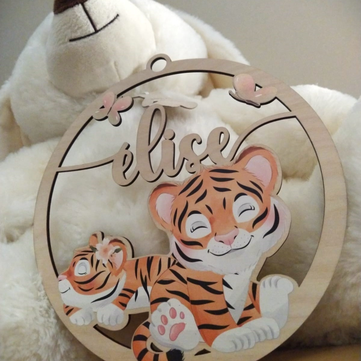 Les parents qui cherchent une couronne bois prénom chambre enfant, une décoration murale tigre personnalisée ou un cadeau de naissance original en bois découpé laser trouveront dans ce modèle une pièce à part : le prénom fait partie du bois, la couleur est incluse, la pièce est finie. Un cadeau prêt à accrocher, prêt à émouvoir.