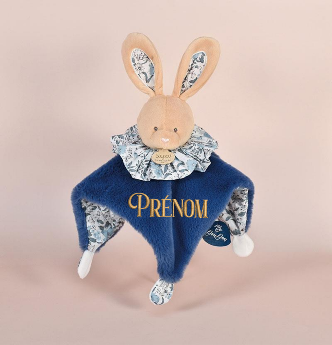 Vous cherchez un doudou lapin bleu brodé prénom cadeau naissance garçon livré rapidement ? Le Doudou Boule Lapin Bleu est expédié sous 7 jours ouvrés et livré sous 10 jours ouvrés maximum à domicile (12 jours en point relais). Il fait aussi un cadeau de baptême doudou brodé original ou un cadeau Pâques bébé personnalisé broderie que toute la famille retiendra. Pour composer un coffret naissance complet dans l’univers lapin, découvrez également notre tour à empiler Lapin Trixie Baby gravée au prénom.