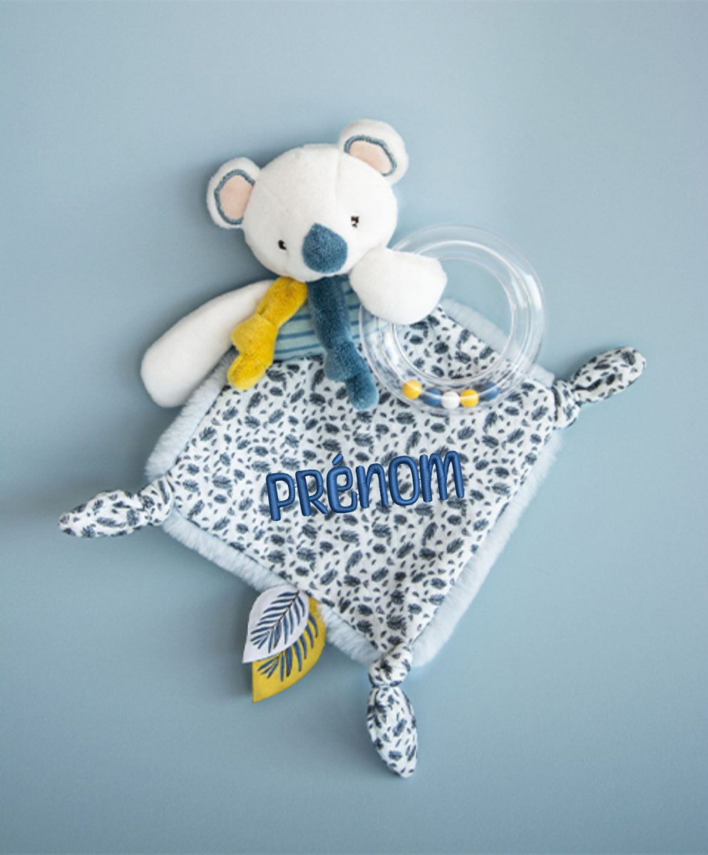 Dans la gamme Doudou & Compagnie, tous les doudous sont des compagnons. Mais rares sont ceux qui ont un nom propre. Yoca le Koala est l’un d’eux — un personnage à part entière, avec sa frimousse de koala, ses harmonies de couleurs tendance, ses touches de langes aux motifs végétaux et ses mélanges de matières très douces. Yoca a une identité, une présence, une histoire. Et lorsque vous y faites broder le prénom de bébé, vous créez un lien encore plus personnel entre l’enfant et son premier compagnon.