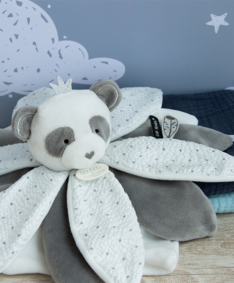 Du chic, du raffinement et des paillettes argent : le Panda Attrape-rêves est le doudou pétale le plus élégant de la gamme Doudou & Compagnie, brodé au prénom de bébé.