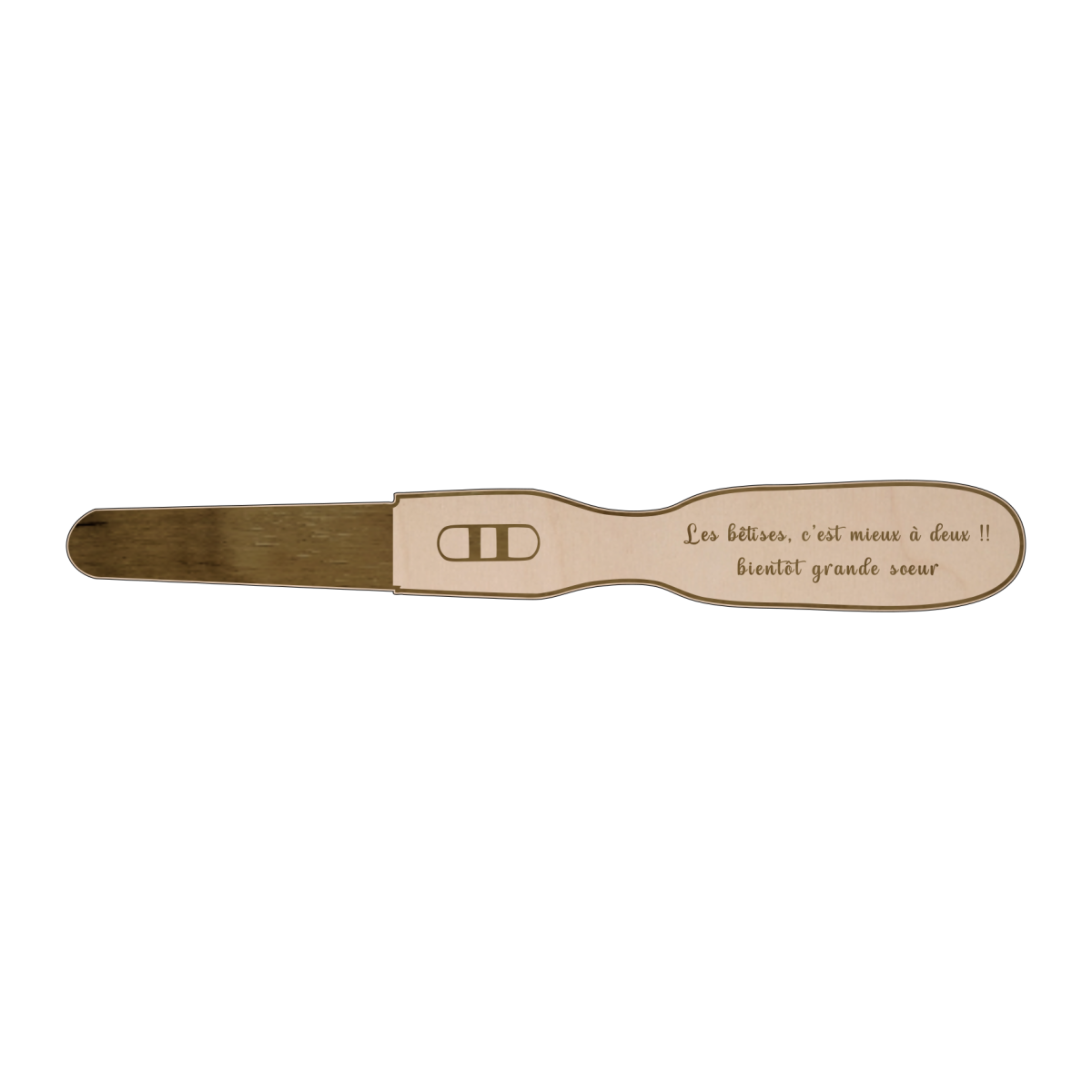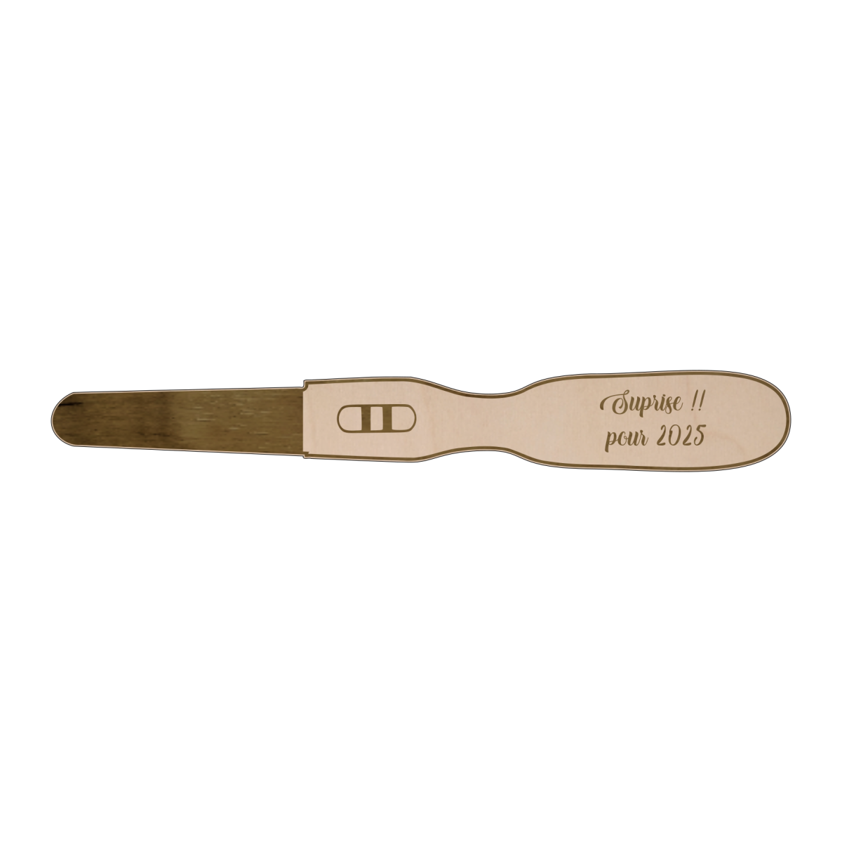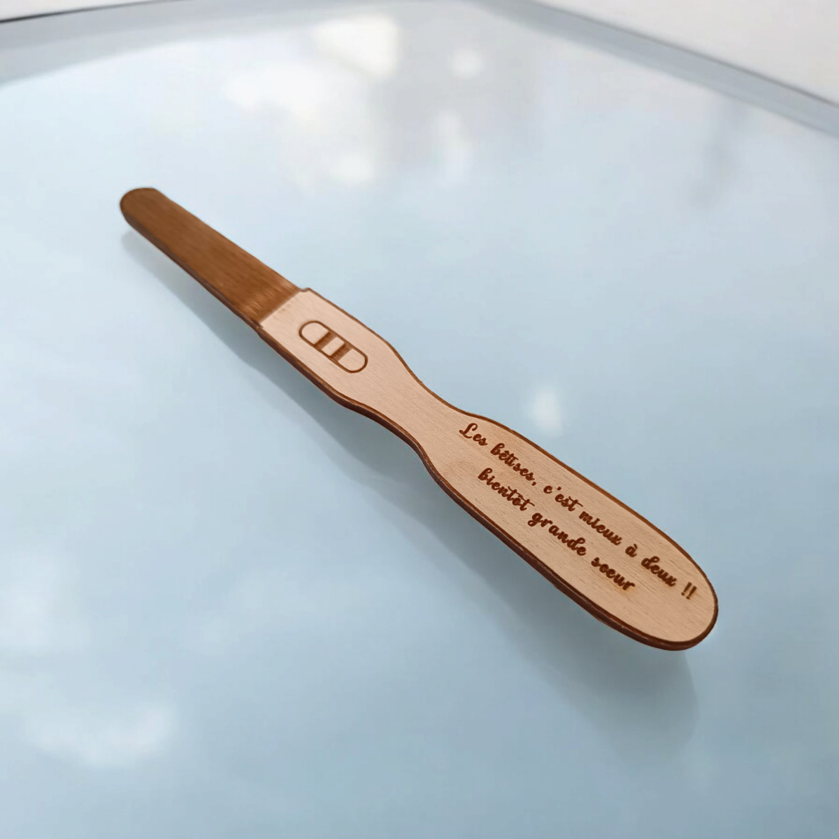 Contrairement à une carte ou un ticket à gratter, le test en bois ne s’use pas. Il peut être posé sur une étagère de chambre, intégré dans un album de grossesse ou offert avec d’autres souvenirs de naissance. Gravé dans le bois, le message reste intact des années après — c’est un objet de mémoire autant qu’un accessoire d’annonce.