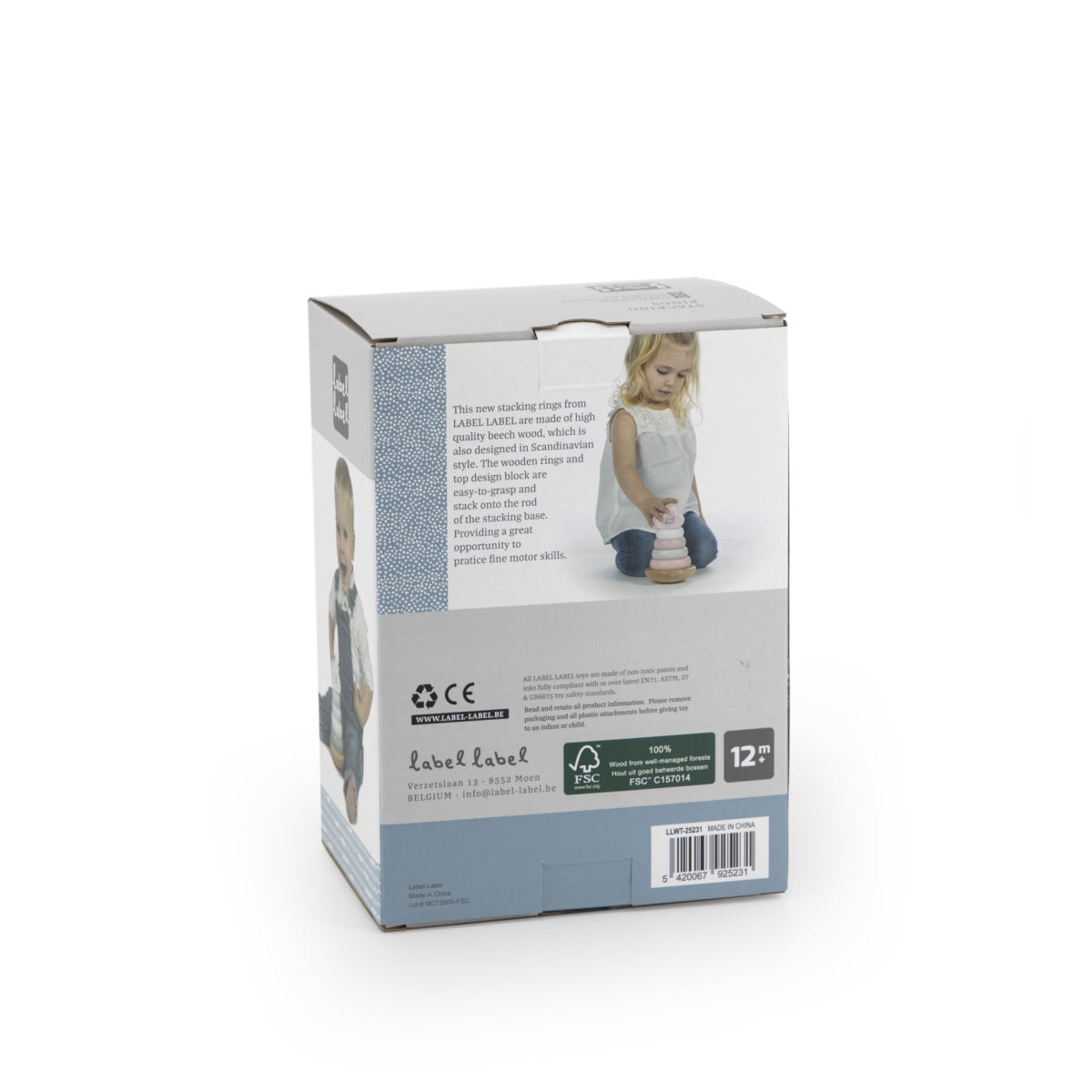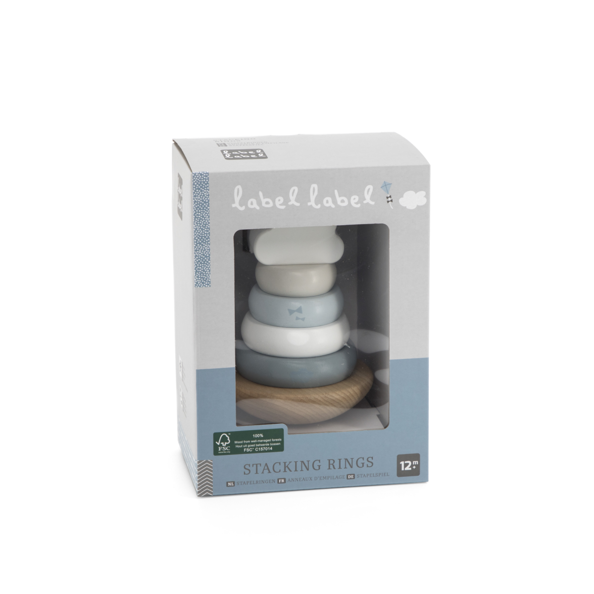 La tour à empiler Nuage Blanc Label Label est la version la plus épurée de la gamme : ses anneaux blanc et gris aux reflets doux s’accordent avec toutes les chambres d’enfant, quelle que soit la palette choisie par les parents. Ce minimalisme apparent contraste avec la richesse de la personnalisation : cinq informations de naissance — prénom, date, heure, poids et taille — sont gravées au laser dans le bois de hêtre certifié FSC, révélant le grain naturel du bois sous la peinture à base d’eau non toxique.